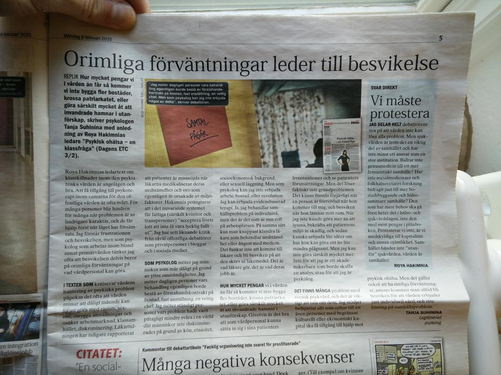 Roya Hakimnias ledartext om klasskillnader inom den psykiatriska vården är angelägen och bra. Att få tillgång till psykoterapi inom ramarna för den offentliga vården är ofta svårt. För många personer blir hindren för många när är av lindrigare karaktär, och de får hjälp först när läget har försämrats. Jag förstår frustrationen och besvikelsen, men som psykolog som arbetar inom bland annat primärvården tänker jag ofta att besvikelsen delvis beror på orimliga förväntningar på vad vårdpersonal kan göra.